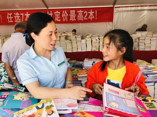 4月19日,在世界读书日即将来临之际,云南省红河哈尼族彝族自治州建水县邮政分公司联合县文明办等单位举办的“全民阅读 书香建水”大型图书活动启动。活动浓郁的书香氛围受到市民的欢迎,为建水县精神文明建设贡献一份力。图为建水县朝阳北路营业所营业员为儿童讲解图书内容。□赵祝甜  摄影报道