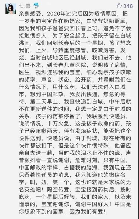 “感谢邮政,让我被困在湖北那段日子里,还能收到来自外地小伙伴的防疫用品援助,余后很多年都会记得,在2020年初那个困难的日子里,祖国需要,邮政在!”
