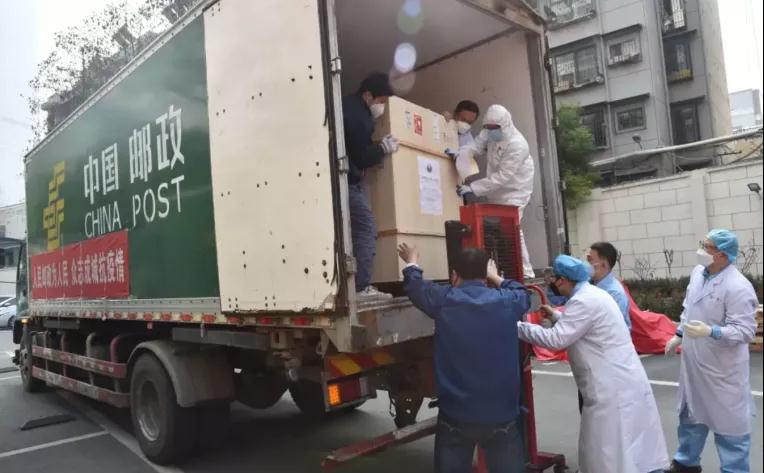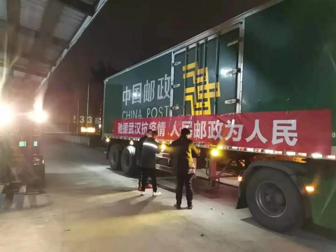来自全国各地的各类物资,不分昼夜地被邮政运输车送进疫区。