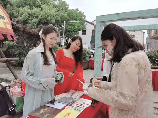 5月30日下午,为配合集市主题,集邮与文化传媒部的工作人员早已换好汉服,梳着仿古发髻,在显著摊位上摆放好了一应产品。