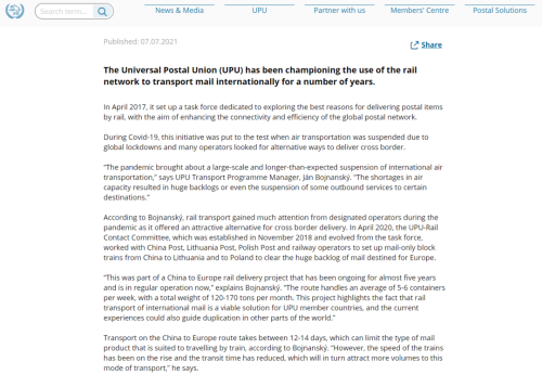 邮联运输项目组经理扬·博伊南斯基表示:“这一邮路每周可带运5-6个铁路集装箱,总重量约为120-170吨/月。这一项目进一步证实了铁路运邮可为各成员国提供可行的运输方案这一事实,当前的运邮经验也可为其在全球其它范围内的推广提供指导意见。同时,铁路运输的速度正在不断提升,经转时限也不断缩短,这也将为铁路运邮吸引更多的业务量。”