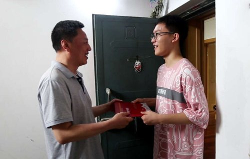 王晓宏将国科大本科生录取通知书邮件送到王鹤鸣手中。受访者供图