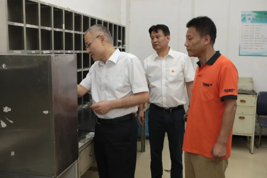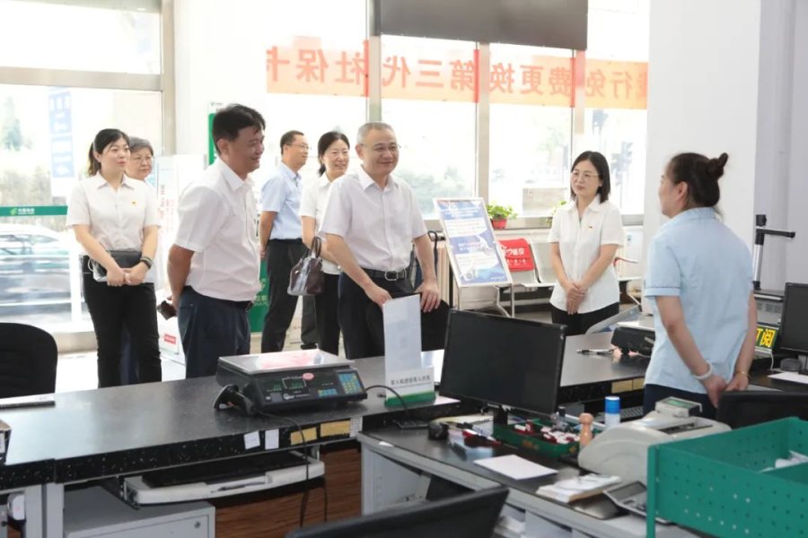 在调研新开中路营业所时,石纯斌总经理每到一处都亲切地与营业员握手交谈,仔细询问网点金融业务规模、客户数量,普服业务日均受理业务量等情况,对厅堂布局,集邮、渠道业务展示区设置提出指导意见。