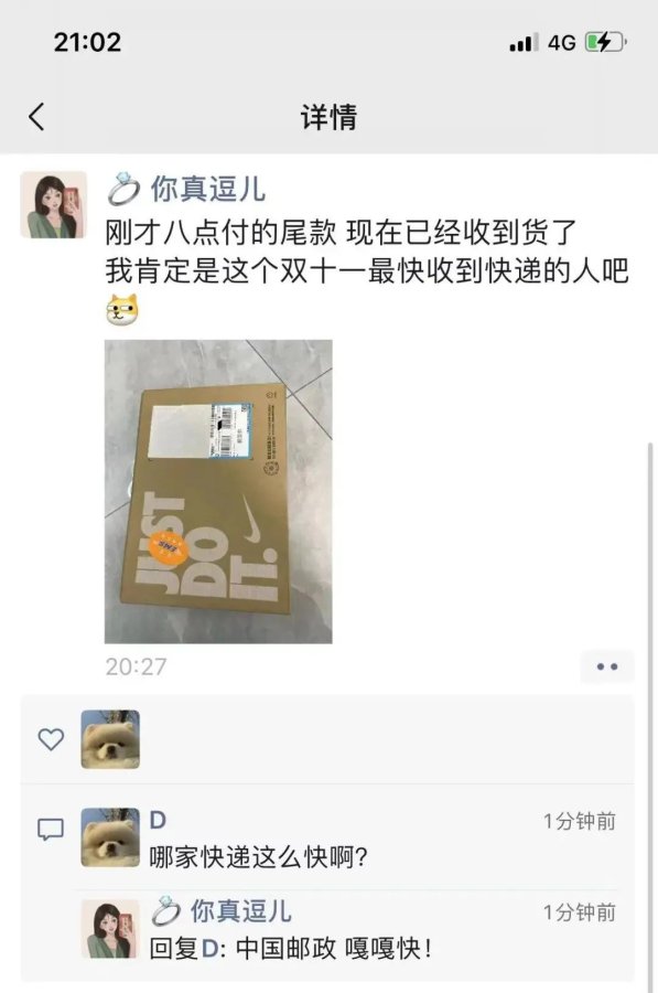 八点刚付的尾款,现在已经收到快递了,我肯定是这个‘双11’最快收到快递的人了吧。