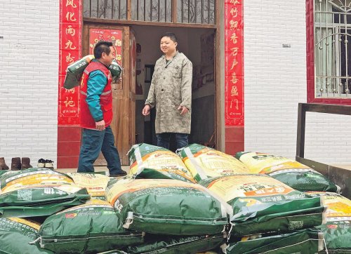 湖北省天门市邮政分公司党委积极服务“三农”发展,助力乡村振兴,成立党员志愿服务队为丘陵地区的果农配送肥料,助推特色产业发展。图为近日李场邮政支局党员黄祥忠用手扶拖拉机将肥料配送到果农家中。