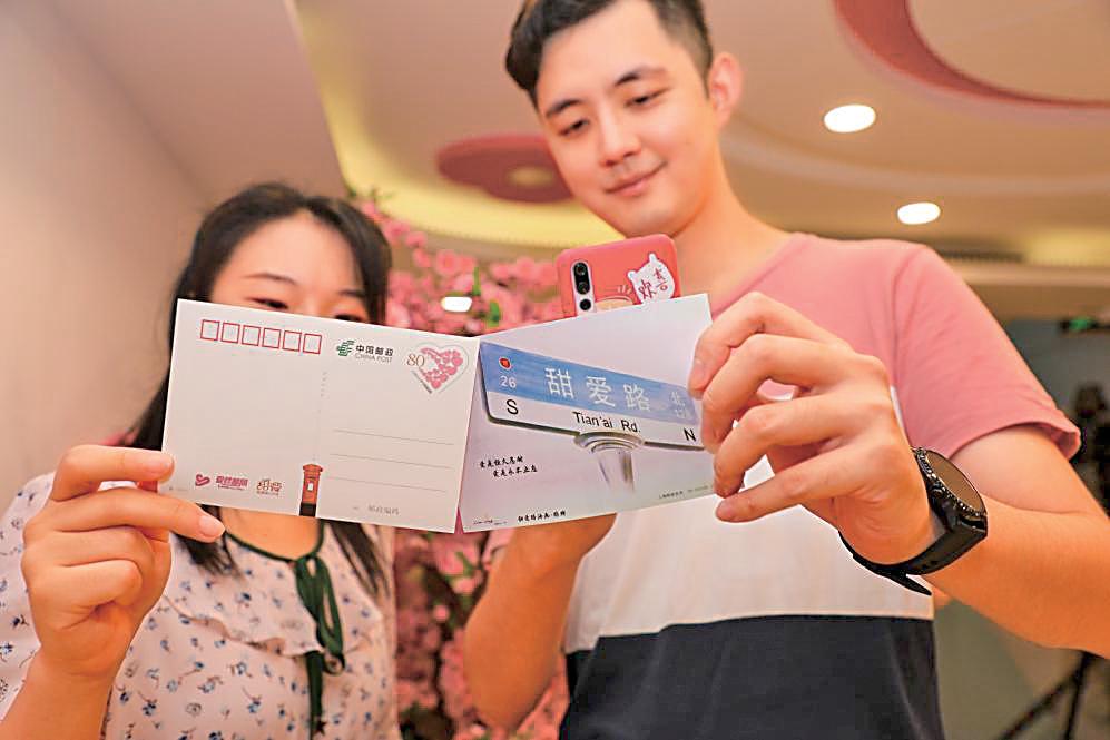 5月20日一大早,位于上海最“甜”的马路——甜爱路上的甜爱婚姻登记中心已经聚集了不少新人。他们或手牵手,或相依偎,脸上洋溢着幸福的笑容。现场正在举办的是由上海爱情邮局和甜爱婚姻登记中心共同发起的“520”主题活动。婚姻登记中心内的邮政展位前,新人们兴奋地排队等待着,他们有的在“爱情明信片”上写下爱情寄语,有的将婚纱照定制成精美的爱情邮折或爱情储值卡。最让人期待的环节莫过于将写有甜蜜话语的明信片投入粉色的“爱情邮筒”,让爱的仪式感瞬间拉满。