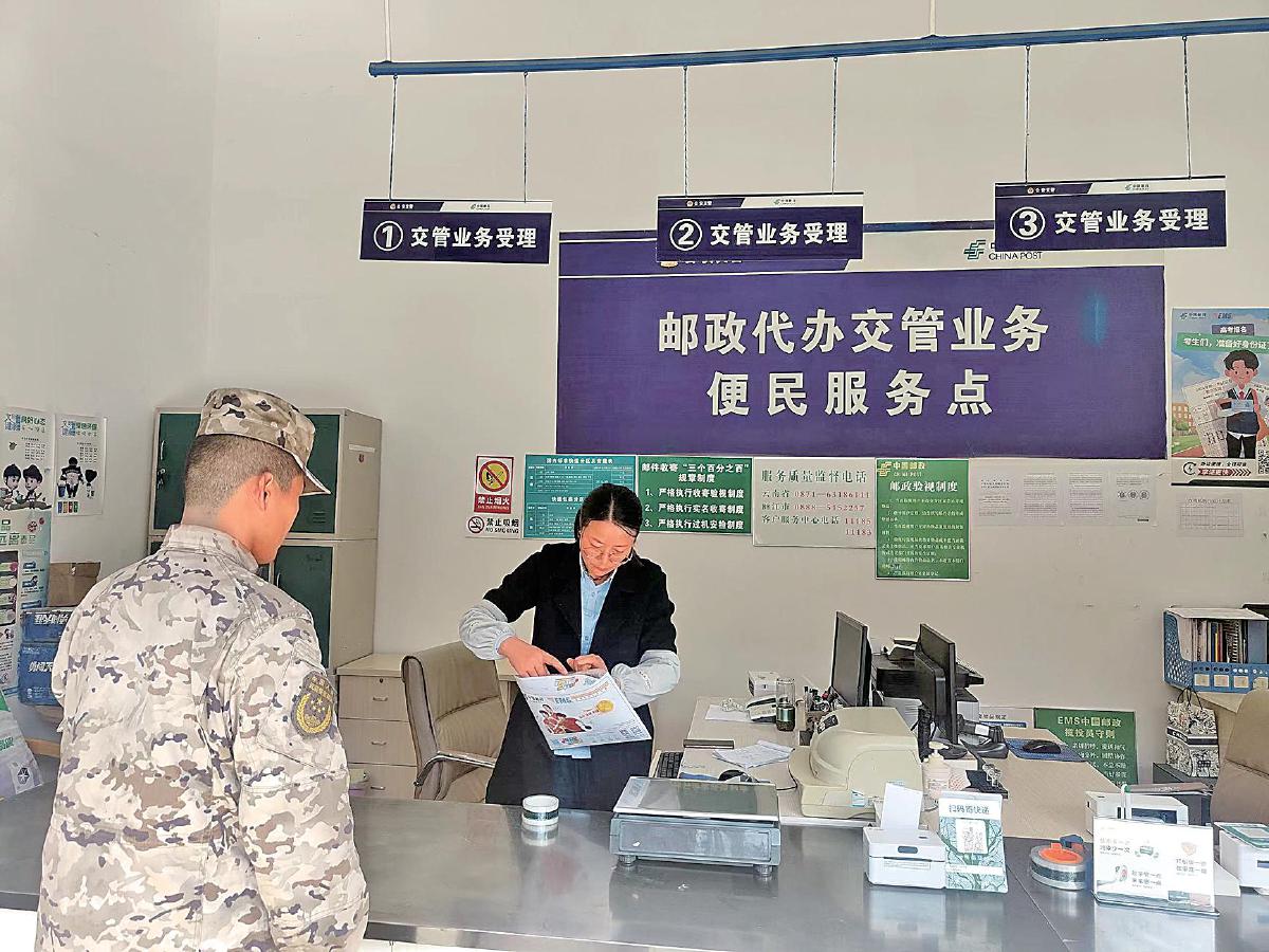 丽江邮政交管业务便民服务点的工作人员为客户办理交管业务。