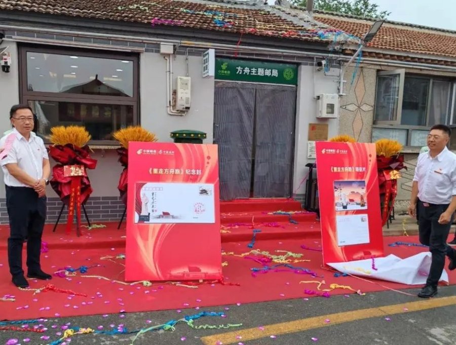 为纪念邮局开业,天津邮政特发行《重走方舟路》纪念封及主题明信片。宁河区俵口镇书记刘国华、红舟文化发展有限公司经理董晓东为纪念封、明信片揭幕。