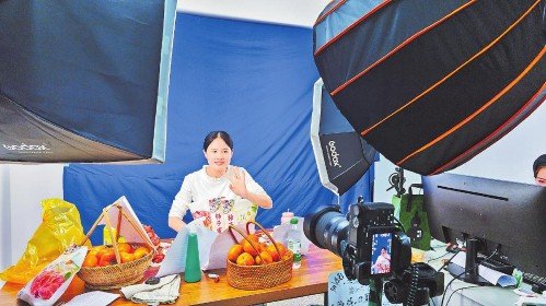 平乐邮政主播在电商直播间推介柿子系列产品。 □唐何溪 摄