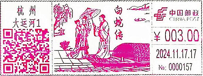 迎接乙巳蛇年,浙江省杭州市邮政分公司特别启用“白蛇传”邮资机宣传戳一枚,绘制的是许仙为白娘子撑伞的动人画面。