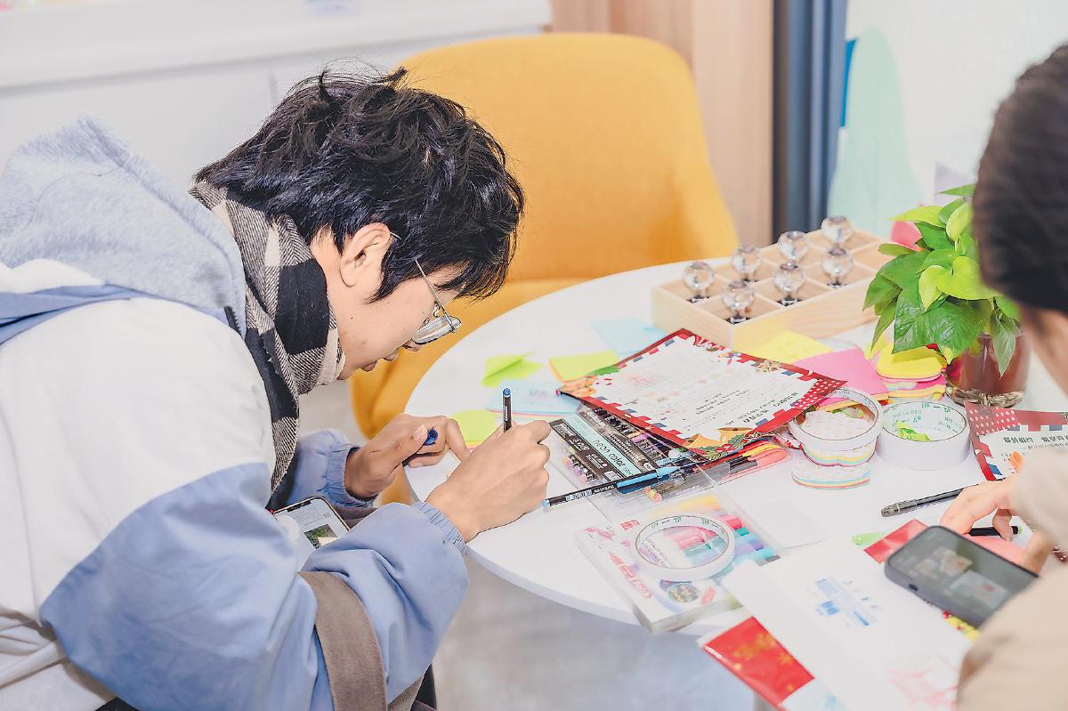 邮局内的有声明信片打印机也大受欢迎。学生们可以自己扫码设计明信片,上传1分钟语音,用机器打印带邮资的个性化明信片,并亲手加盖纪念戳和日戳、投入信筒寄出。收件方扫描明信片上的二维码即可聆听寄出方的声音。一位女同学用好朋友的照片制作了一张明信片。她说:“这张明信片里有好友的照片和我的声音,跨越千里的祝福瞬间就能在耳边响起!”校园邮局还开展了“邮情相约,悦享青春”主题活动。在外围的留言墙上,大家可以书写心愿和祝福,盖上“隐藏款”无锡主题渐变戳。学生们纷纷感慨道:“现在有了这么多富有江大特色的专属产品,可以给朋友寄出带有‘江大印记’的祝福了!”