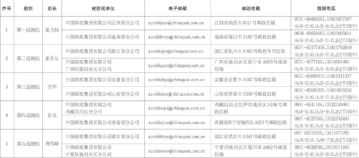 中国邮政集团有限公司党组2025年第一批巡视进驻信息一览表
