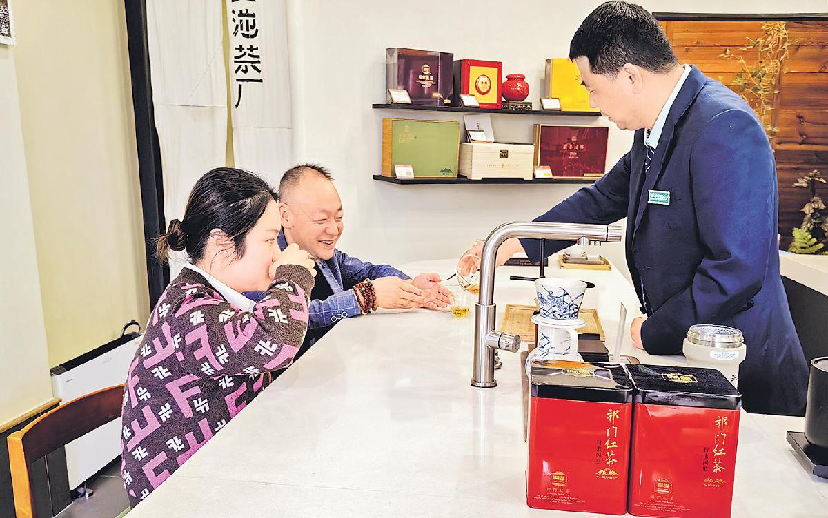 游客在祁红主题邮局品茶。