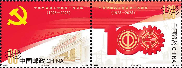 1925年5月1日,中华全国总工会在广州正式成立。百年来,在党的领导下,中华全国总工会栉风沐雨,始终与党同心、跟党奋斗,前赴后继、奋勇拼搏,艰苦奋斗、建功立业,谱写了壮丽的篇章。《中华全国总工会成立一百周年》纪念邮票图案采用连票设计形式,以红色为主色调。第一枚“亿万职工心向党”,以党徽、中华全国总工会广州旧址为画面主体,以意象化的红旗为背景,并点缀心形图案,象征中华全国总工会初心向党,在党的领导下走过百年光辉历程。第二枚“团结奋斗新征程”,将中华全国总工会会徽、齿轮、芯片等与数字“100”组合设计,以意象化的红旗为背景,并辅以城市建筑、港口、高铁、飞机、火箭、空间站及劳动者等元素,象征着进入新时代以来,中华全国总工会在党的领导下不断奋进,为实现中华民族伟大复兴作出更大贡献。