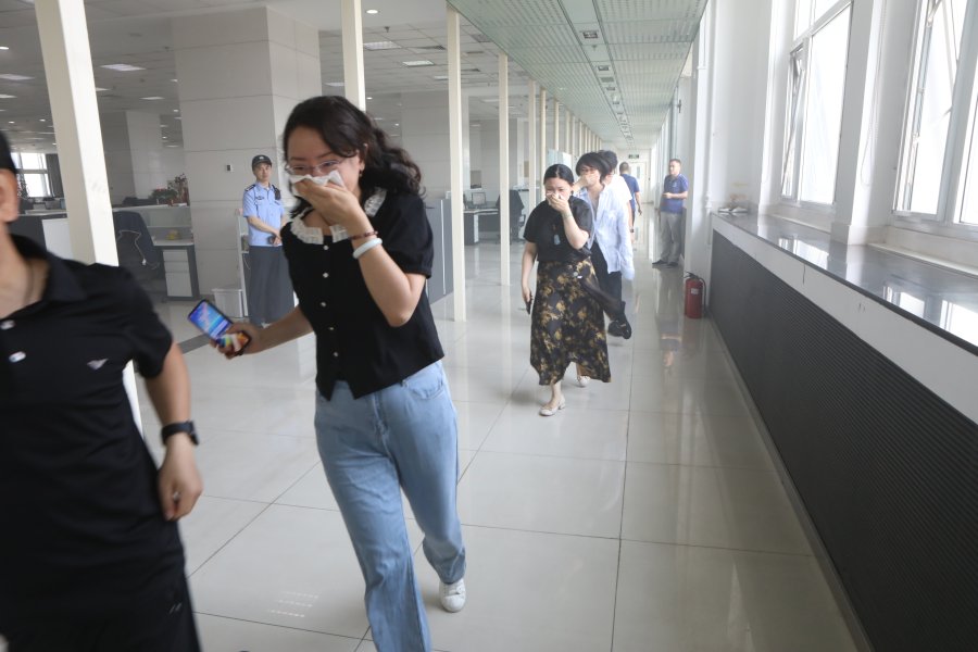 各楼层生产办公人员听到警报后按照逃生指示标识,快速、有序地从楼梯紧急通道疏散到办公楼外。