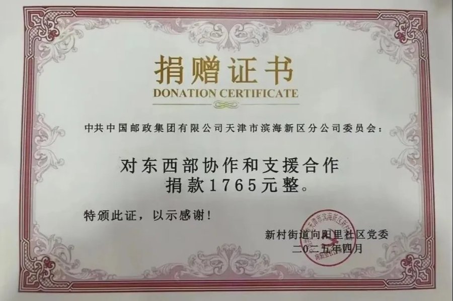 聚焦滨海新区东西部协作和支援合作地区需求,联合共建单位新村街道向阳里社区党委,向两委全体干部职工发出捐款倡议,募集善款共计1765元,全部用于甘肃省甘南州合作市、天水市张家川县、青海省黄南州三个受援地区建设,为加强对贫困地区资金支持贡献出了邮政力量。