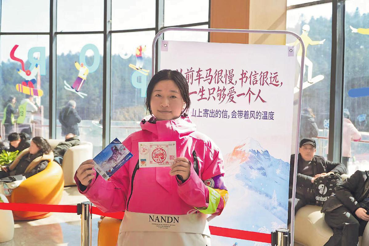 滑雪爱好者展示赛事联名款明信片。
