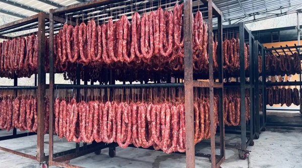 图为满满当当的香肠悬挂在铁架之上,正在进行风干工序。