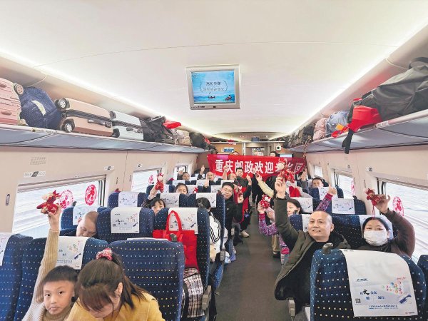 2月4日,G3724次高铁上,重庆邮政工作人员陪伴老乡返乡过年。 □魏馨 摄