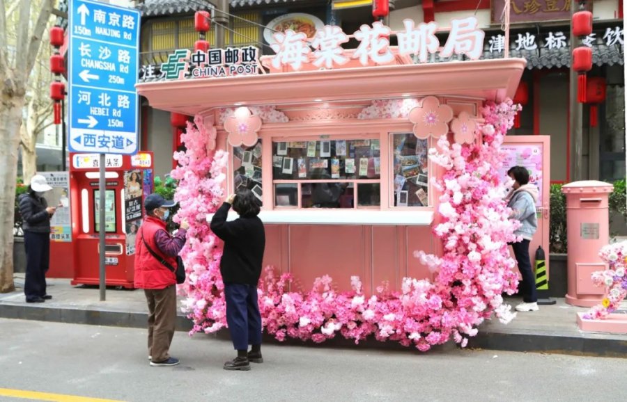 这家坐落于五大道文化旅游区(和平区山西路与西安道交口)的主题邮局,由原有报刊亭升级改造而成,粉色的外观搭配满墙海棠元素,成为春日里一道亮眼风景线。