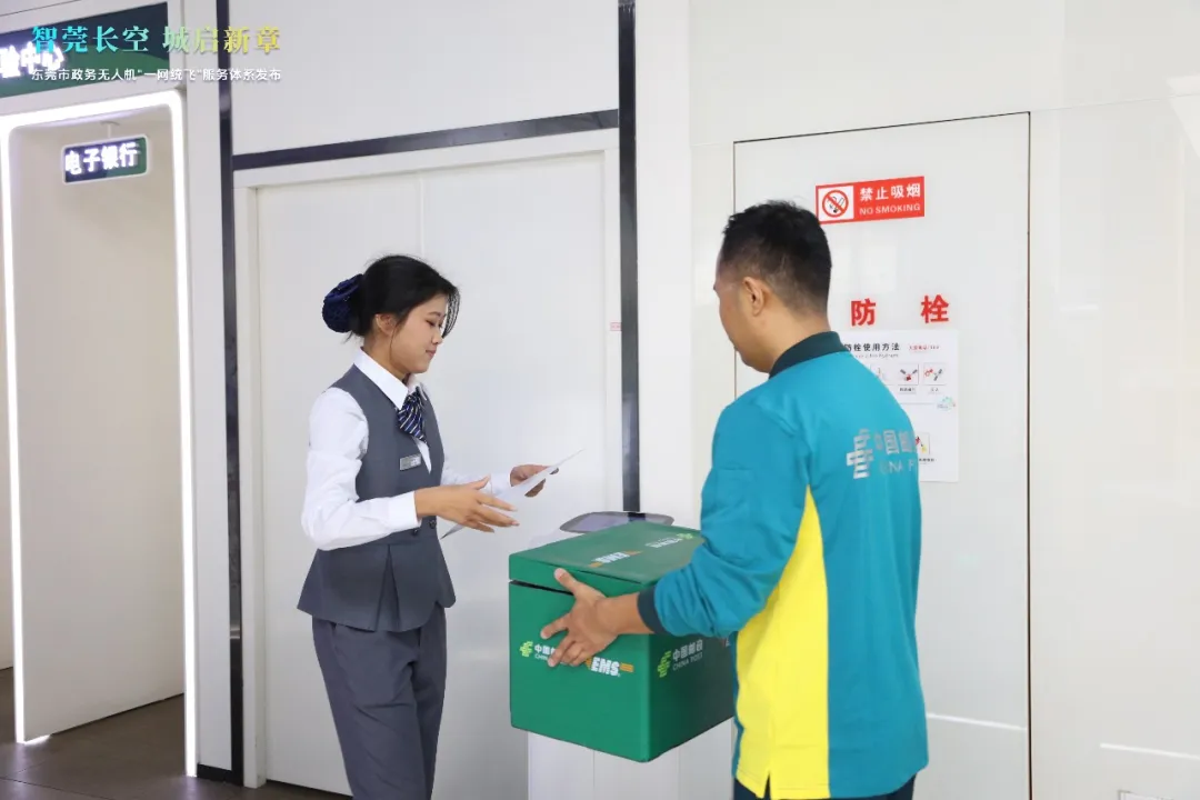 当天,寮步镇一家企业因签约紧急,需加急办理营业执照变更。东莞邮政首次启用无人机邮路承运该紧急任务。上午10时,相关材料从寮步镇政务服务中心通过无人机发出,跨越12.6公里,仅10余分钟便精准送达市民服务中心,从无人机起飞,到工作人员接件流转,全程无缝衔接。